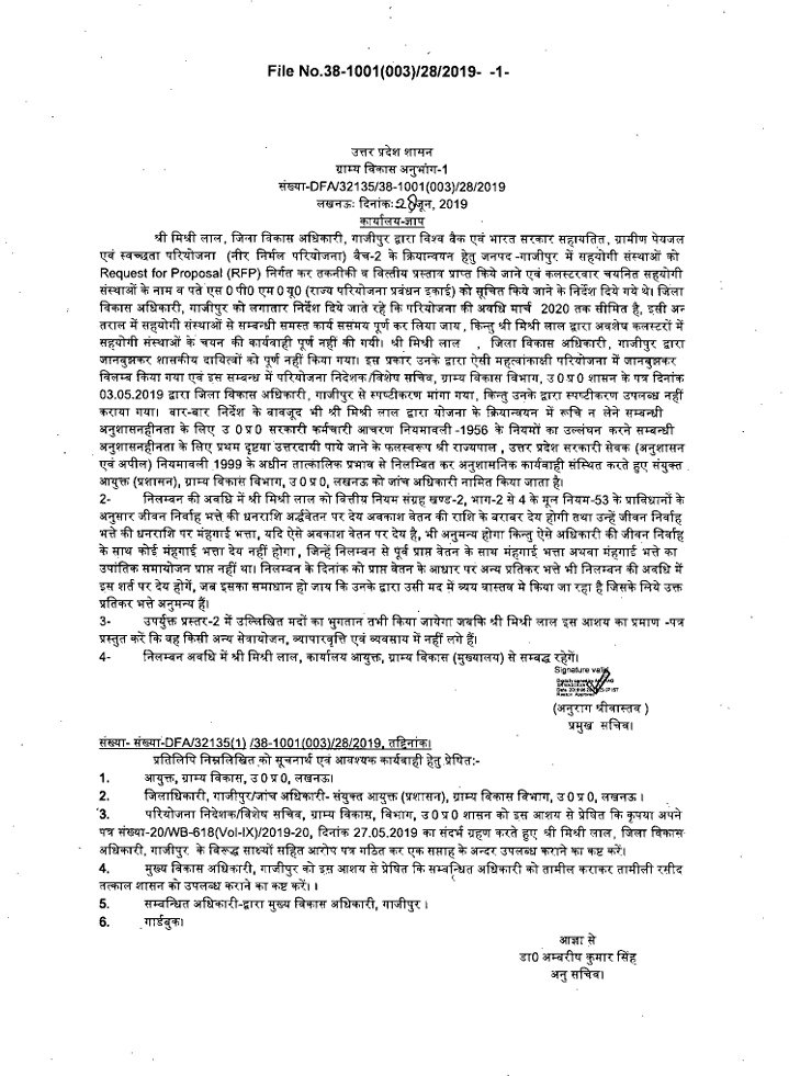 बताया गया है कि विश्व बैंक एवं भारत सरकार सहायतित ग्रामीण पेयजल एवं स्वच्छता परियोजना के क्रियान्वयन हेतु जनपद गाजीपुर में सहयोगी संस्थाओं का कलस्टर वार चयनित कर उनके नाम व पते राज्य परियोजना प्रवंधन इकाई को सूचित करने के लगातार निर्देश के बावजूद श्री मिश्रीलाल द्वारा अवशेष कलस्टरों में सहयोगी संस्थाओं के चयन की कार्यवाही पूर्ण नहीं की गई है इसी मामले को लेकर कई बार जिला विकास अधिकारी से स्पष्टीकरण मांगा गया लेकिन जिला विकास अधिकारी ने कोई जवाब नहीं दिया।