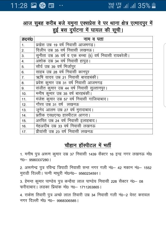 घायलों और मृतकों के परिजनों को जानकारी जुटाने के लिए पुलिस ने जारी किया कंट्रोल रूम का नंबर – 0562226001. घायल व मृतक के परिजन इस नम्बर पर जानकारी ले सकते हैं ।
