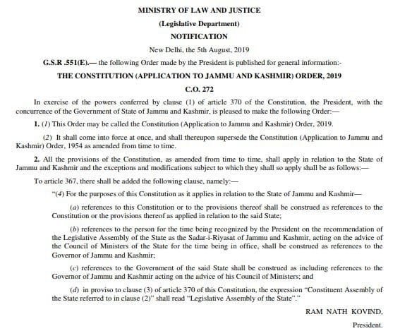 बताते चलें कि प्रधानमंत्री नरेंद्र मोदी के आवास पर आज कैबिनेट की महत्वपूर्ण बैठक में यह फैसला लिया गया था। अब अनुच्छेद 370 के तहत जम्मू-कश्मीर को मिले विशेषाधिकार अब खत्म हो गये और जम्मू-कश्मीर भी भारत के अन्य राज्यों की तरह एक राज्य होगा।