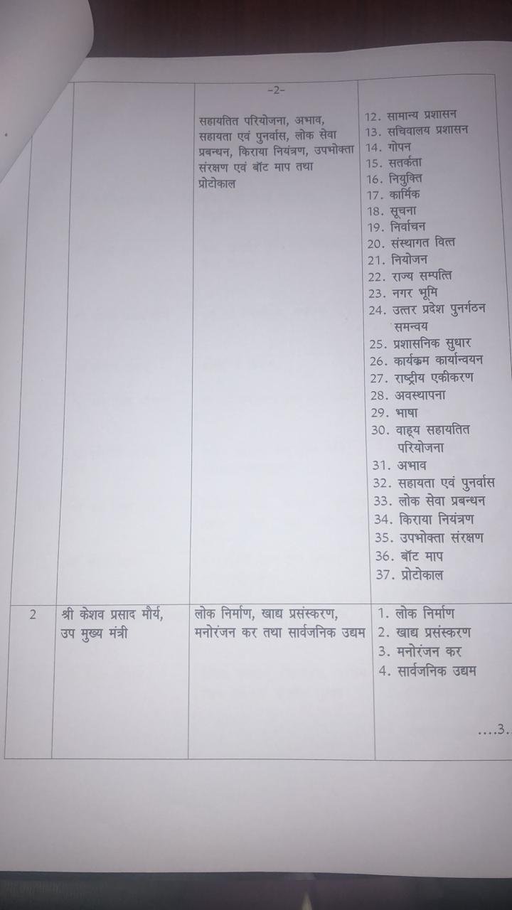 लखनऊ, 23 अगस्त 2019। मुख्यमंत्री योगी आदित्यनाथ द्वारा प्रथम मंत्रीमंडल विस्तार के बाद मंत्रियों के विभागों का बटवारा किया गया है जिसके अनुसार …उप मुख्यमंत्री केशव प्रसाद मौर्या – लोक निर्माण ,खाद्य प्रसंस्करण, मनोरंजन कर ,सार्वजनिक उद्यम