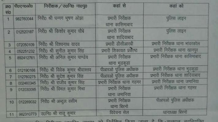 जारी सूची के अनुसार निरीक्षक पन्नग भूषण ओझा को प्रभारी निरीक्षक थाना कासिमाबाद से पुलिस लाइन, निरीक्षक किशोर कुमार चौबे प्रभारी निरीक्षक थाना शादियाबाद से पुलिस लाइन, निरीक्षक विश्वनाथ यादव प्रभारी डीसीआरबी से प्रभारी निरीक्षक थाना भावरकोल, निरीक्षक सुनील कुमार सिंह प्रभारी शिकायत प्रकोष्ठ से प्रभारी निरीक्षक थाना खानपुर, निरीक्षक अनिल कुमार पांडेय प्रभारी निरीक्षक थाना भुड़कुड़ा से प्रभारी निरीक्षक थाना कासिमाबाद, निरीक्षक विवेक कुमार श्रीवास्तव पीआरओ पुलिस अधीक्षक से प्रभारी निरीक्षक थाना भुड़कुड़ा, निरीक्षक सुदेश कुमार सिंह पीआरओ पुलिस अधीक्षक से प्रभारी निरीक्षक थाना शादियाबाद, निरीक्षक राजीव कुमार सिंह प्रभारी निरीक्षक थाना गहमर से प्रभारी निरीक्षक थाना जमानियां, निरीक्षक विमल कुमार मिश्रा प्रभारी निरीक्षक थाना जमानिया से प्रभारी निरीक्षक थाना गहमर, निरीक्षक अब्दुल वसीम प्रभारी निरीक्षक थाना बिरनो से पीआरओ पुलिस अधीक्षक तथा उप निरीक्षक राजू कुमार को विवेचना सेल से थानाध्यक्ष बिरनो का प्रभार सौंपा गया है।