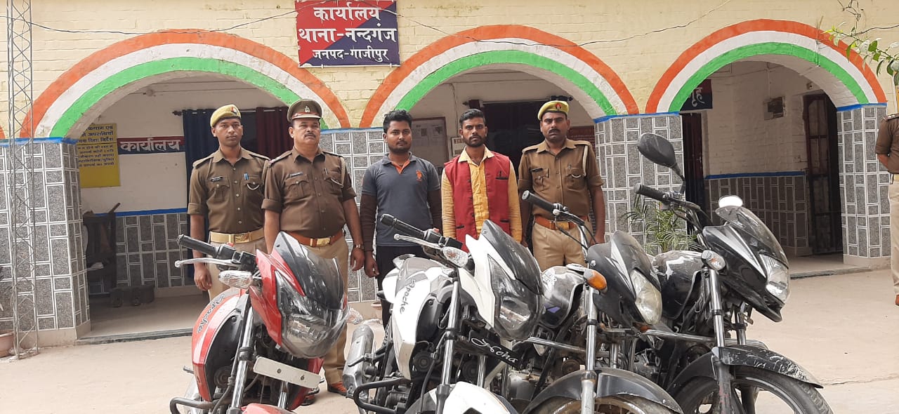 गाज़ीपुर, 12 दिसम्बर 2019। जनपद में अपराधों की रोकथाम व अपराधियों की धरपकड़ हेतु पुलिस अधीक्षक के निर्देशन में वाहन लुटेरों/ चोरों के विरुद्ध चलाये जा रहे अभियान के क्रम में थाना प्रभारी नन्दगंज और स्वाट टीम प्रभारी अपनी टीम सहित क्षेत्र में भ्रमणशील थे। रात करीब साढ़े तीन बजे उन्हें सूचना मिली कि पांच बदमाश चोरी एवं लूट की बाइक के साथ सोन्हौली से देवकली ब्लाक की तरफ आ रहे है।
