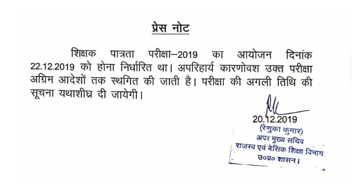 प्रयागराज,20 दिसम्बर 2019। प्रदेश में 22 दिसंबर रविवार को होने वाली अध्यापक पात्रता परीक्षा ( यूपीटीईटी ) को स्थगित कर दिया गया है। राजस्व एवं बेसिक शिक्षा विभाग की ओर से जारी नोटिस में कहा गया है कि अपरिहार्य कारणों से उत्तर प्रदेश शिक्षक पात्रता परीक्षा (यूपी टीईटी ) स्थगित की जाती है। परीक्षा की नई तिथि की सचूना जल्द से जल्द दी जाएगी। इस परीक्षा में 16 लाख 58 हजार परीक्षार्थी शामिल हो रहे हैं। परीक्षा संपन्न कराने के लिए 1986 परीक्षा केंद्र बनाए गए थे।