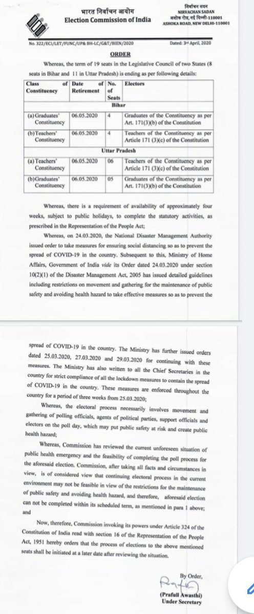 कोरोना वायरस के कारण लाकडाउन के चलते वर्तमान समय में चुनाव प्रक्रिया इस माह में सम्भव नही है। इसलिए केन्द्रीय चुनाव आयोग ने संविधान के अनुच्छेद 324, सहपठित लोक प्रतिनिधित्व अधिनियम 1951 की धारा-16 के तहत प्राप्त अधिकारों का प्रयोग करते हुए आदेश दिये हैं कि विधान परिषद की इन सीटों पर चुनाव प्रक्रिया परिस्थितियों की समीक्षा के बाद अगले आदेशों से शुरू की जाएगी। देखें आदेश……..