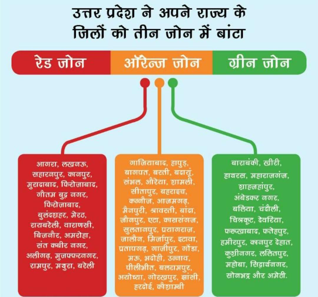 उसी क्रम में, उत्तर प्रदेश के 75 जिलों में भी, जिलों की श्रेणी निर्धारित की गयी है। इस सूची के अनुसार, रेड जोन में उन्नीस जिले,आरेंज जोन में छत्तीस जिले तथा ग्रीन जोन में बीस जिले निर्धारित किये गये हैं।
