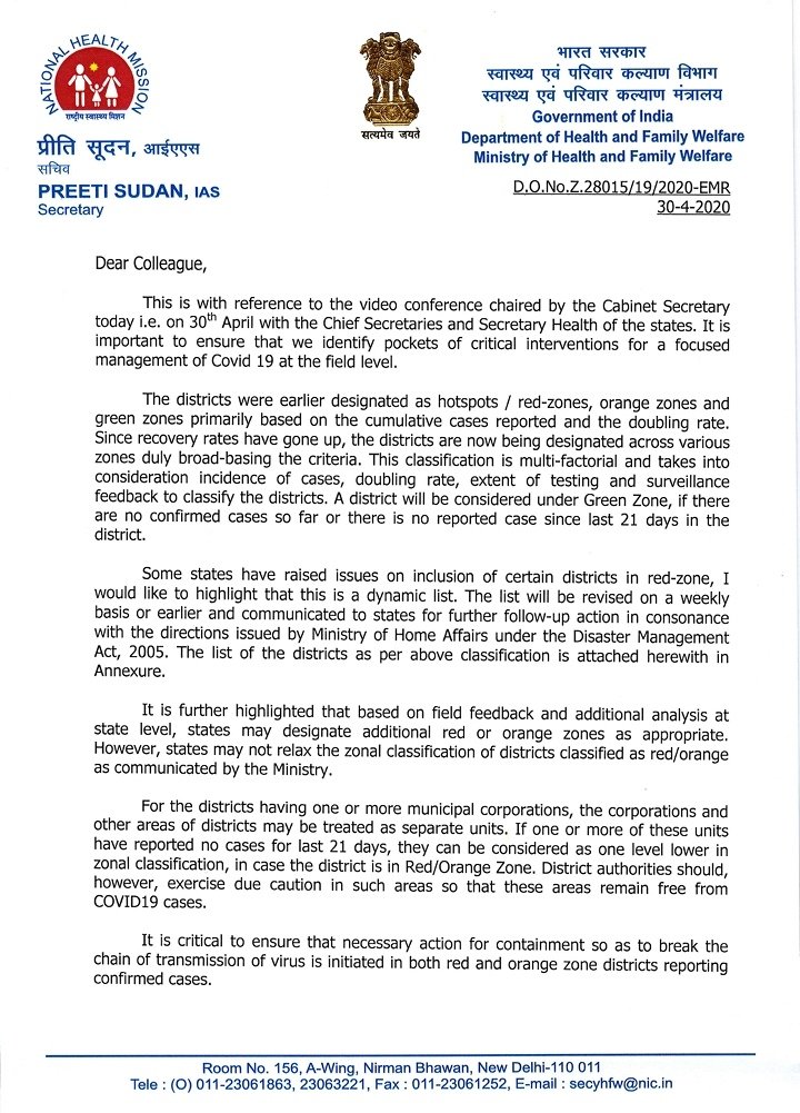 कैबिनेट सचिव की अध्यक्षता में 30 अप्रैल को राज्यों के मुख्य सचिवों और स्वास्थ्य सचिवों के साथ की गई वीडियो कॉन्फ्रेंस के बाद जिलों के इस नए वर्गीकरण की घोषणा की गई। इस नए वर्गीकरण में मुम्बई, दिल्ली, कोलकाता, हैदराबाद, पुणे, बेंगलुरु और अहमदाबाद जैसे महानगर शहरों को रेड जोन में रखा गया है। केन्द्रीय स्वास्थ्य मंत्रालय की सचिव प्रीती सूदन ने राज्यों और केन्द्र शासित प्रदेशों के मुख्य सचिवों को लिखे पत्र में कहा, ‘‘ यह सुनिश्चित करना महत्वपूर्ण है कि हम जमीनी स्तर पर कोविड-19 के एक केन्द्रित प्रबंधन के लिए संवेदनशील इलाकों की पहचान करें।’’ उन्होंने कहा कि जिलों को पहले हॉटस्पॉट्स / रेड-जोन, ऑरेंज जोन और ग्रीन जोन के रूप में नामित किया गया था।‘‘ मरीजों के ठीक होने की दर बढ़ने के बाद, जिलों का वर्गीकरण अब व्यापक मानदंडों के आधार पर किया जा रहा है। यह वर्गीकरण बहु-तथ्यात्मक है और बढ़ते मामलों, उनके दोगुने होने की दर, जांच की क्षमता, निगरानी एजेंसियों से मिली जानकारी के आधार पर इनका वर्गीकरण किया जा रहा है।’’ पत्र के अनुसार किसी भी क्षेत्र को ग्रीन जोन में तभी रखा जाएगा यदि वहां कोविड-19 का कोई पुष्ट मामला ना हो या पिछले 21 दिन में जिले में कोई मामला सामने ना आया हो।वहीं कोई भी रेड या ऑरेंज जोन में शामिल जिले क्रमश: 28 और 14 दिन तक कोई नया मामला सामने न आने के बाद ग्रीन जोन में आ सकते हैं। इस सूची में दिल्ली के 11 जिलों को रेड जोन (हॉटस्पॉट्स) घोषित किया गया है। वहीं महाराष्ट्र के 14 जिले रेड जोन, 16 ऑरेंज जोन और छह ग्रीन जोन में शामिल हैं। गुजरात के नौ जिले रेड जोन, 19 ऑरेंज जोन और पांच ग्रीन जोन में हैं। मध्य प्रदेश के नौ जिले रेड जोन, 19 ऑरेंज जोन और 24 ग्रीन जोन में हैं। राजस्थान के आठ रेड, 19 ऑरेंज और छह जिले ग्रीन जोन में हैं।उत्तर प्रदेश के 19 जिले रेड जोन, 36 ऑरेंज जोन और 20 ग्रीन जोन में हैं, जबकि तमिलनाडु के 12 जिले रेड जोन, 24 ऑरेंज और एक ग्रीन जोन में हैं।गोवा, अरुणाचल प्रदेश, सिक्किम, मणिपुर, नागालैंड और मिजोरम पूरी तरह ग्रीन जोन में है। तेलंगाना के छह जिले रेड, 18 ऑरेंज और नौ ग्रीन जोन में हैं। आंध्र प्रदेश के पांच जिले रेड जोन, सात ऑरेंज जोन और एक ग्रीन जोन में है। पश्चिम बंगाल के 10 जिले रेड जोन, पांच ऑरेंज और आठ ग्रीन जोन में हैं।असम, हिमाचल प्रदेश, लद्दाख, मेघालय, पुडुचेरी और त्रिपुरा जैसे कुछ राज्यों में कोई भी रेड जोन नहीं है। कुछ राज्यों द्वारा ‘‘ कुछ क्षेत्रों को रेड-जोन में शामिल करने का मुद्दा’’ उठाए जाने पर सचिव ने कहा कि राज्य स्तर पर क्षेत्र से मिली जानकारी और अतिरिक्त विश्लेषण के आधार पर राज्य उपयुक्त रूप से अतिरिक्त रेड और ऑरेंज जोन घोषित कर सकते हैं। सूदन ने कहा, ‘‘ हालांकि राज्यों को मंत्रालय द्वार