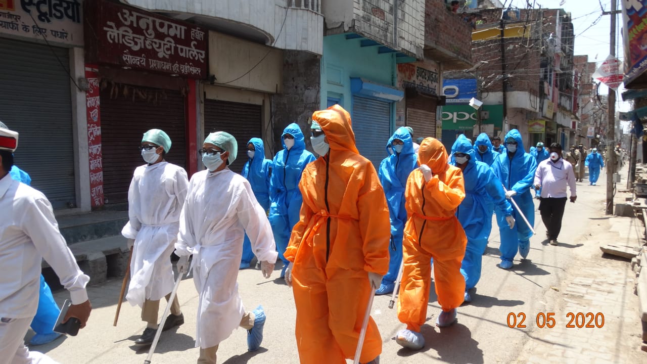 गाजीपुर, 02 मई 2020। वैश्विक महामारी कोरोना के चलते लाकडाउन के बीच कोरोना वायरस से बचाव व लोगों को जागरूक करने के लिए जिलाधिकारी ओमप्रकाश आर्य तथा पुलिस अधीक्षक डा.ओमप्रकाश सिंह द्वारा पुलिस बल के साथ सथर कोतवाली क्षेत्र में रूट मार्च किया गया।इस दौरान अधिकारियों ने लोगों को सोशल डिस्टेंसिंग का पालन करने के लिए, घरों में रहने के लिए तथा कोरोना वायरस से बचाव के लिए कहा गया। रुट मार्च में पुलिसकर्मियों द्वारा पर्सनल प्रोटक्शन इक्विपमेंट(पी0पी0ई0 किट) पहनकर लोगों को कोरोना वायरस से बचने के लिए सरकार द्वारा दी गई गाइडलाइंस का पालन करने के लिए कहा गया। देखें वीडियो……