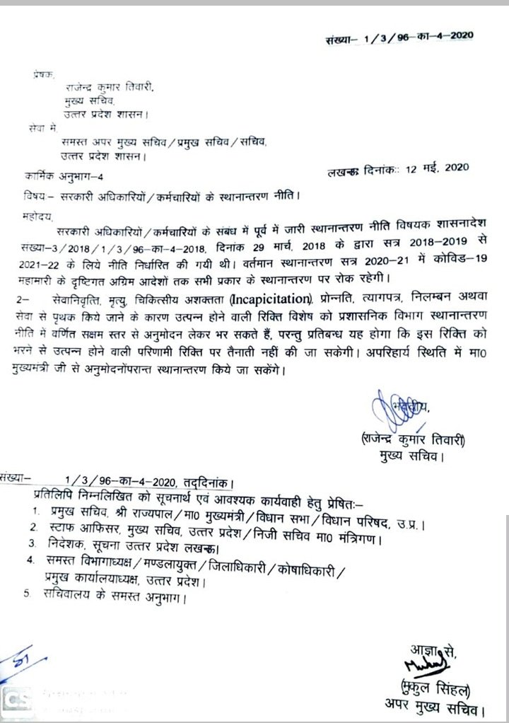 प्रदेश के मुख्य सचिव आर. के. तिवारी द्वारा मंगलवार देर रात जारी आदेश में कहा गया कि कोरोना वायरस महामारी के मद्देनजर मौजूदा तबादला सीजन 2020-2021 के लिए सभी तबादले अग्रिम आदेश तक प्रतिबंधित रहेंगे। आदेश में स्पष्ट किया गया है कि अपरिहार्य कारणों से होने वाले तबादले मुख्यमंत्री योगी आदित्यनाथ की मंजूरी के बाद ही हो सकेंगे। वहीं आदेश में कहा गया कि मृत्यु, चिकित्सा आपात स्थिति, प्रोन्नति, इस्तीफे, निलंबन जैसे कारणों से रिक्त हुए पद संबंधित अधिकारियों की मंजूरी के बाद स्थानांतरण से भरे जा सकते हैं।
