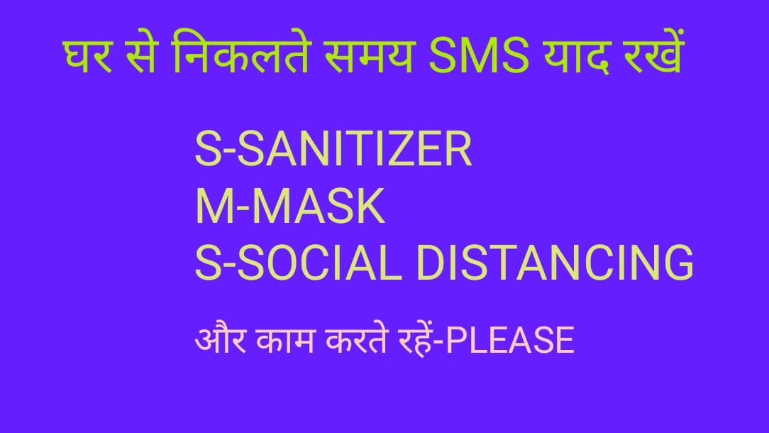 इसी क्रम में सोशल मीडिया के माध्यम से जनजागरूकता फैलाने के उद्देश्य से एस-एम-एस याद रखने की सलाह, जिला स्काउट मास्टर फ़िरोज़ आलम खान ने दी है। उन्होंने कहा कि जनजागरूकता फैलाने के उद्देश्य से आज एस एम एस याद रखने की आवश्यकता है। एस अर्थात सेनेटाइजर, एम अर्थात मास्क तथा एस अर्थात सोशल डिस्टेनसिंग।
