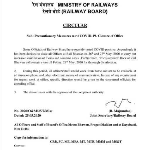 बताते चलें कि रेल मुख्यालय की इस इमारत में एक पखवारे के भीतर ही पांच लोग संक्रमित पाये जा चुके हैं। सूत्रों के अनुसार 19 मई तक कार्यालय में ड्यूटी करनेवाला चतुर्थ श्रेणी कर्मचारी पच्चीस मई को को कोरोना पाजीटिव मिला। इससे पूर्व वहां एक महिला अधिकारी जो 20 मई को कार्यालय आयीं थी, वे भी संक्रमित पायी गयीं। वह रेलवे मुख्यालय में एक सप्ताह के भीतर पाया जाने वाला चौथा मामला था।