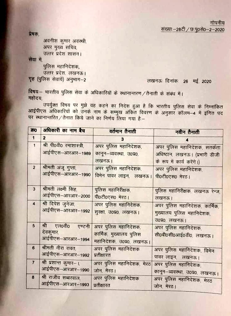 लखनऊ, 26 मई 2020। अपर मुख्य सचिव उ.प्र. अवनीश कुमार अवस्थी ने मुख्यमंत्री के निर्देश पर पर भारतीत पुलिस सेवा में कार्यरत वरिष्ठ पुलिस उच्चाधिकारियों का स्थानांतरण करते हुए उन्हें नयी तैनाती दी है। इसके अनुसार पी.बी.रमाशास्त्री अपर पुलिस महानिदेशक कानून व्यवस्था को अपर पुलिस महानिदेशक सतर्कता अधिष्ठान, श्रीमती अंजू गुप्ता अपर पुलिस महानिदेशक विमेन पावर लाइन, लखनऊ को अपर पुलिस महानिदेशक पीटीएस मेरठ, श्रीमती लक्ष्मी सिंह पुलिस महानिरीक्षक पीटीएस मेरठ को पुलिस महा निरीक्षक लखनऊ रेंज, दीपेश जुनेजा अपर पुलिस महानिदेशक सुरक्षा उत्तर प्रदेश को अपर पुलिस महानिदेशक कार्मिक मुख्यालय पुलिस महानिदेशक उत्तर प्रदेश लखनऊ, एलवी एंटोनी देवकुमार अपर पुलिस महानिदेशक कार्मिक मुख्यालय महानिदेशक उत्तर प्रदेश लखनऊ को अपर पुलिस महानिदेशक सीबीसीआईडी लखनऊ, श्रीमती नीरा रावत अपर पुलिस महानिदेशक प्रतीक्षारत को अपर पुलिस महानिदेशक विमेन पावर लाइन लखनऊ, प्रशांत कुमार अपर पुलिस महानिदेशक मेरठ जोन मेरठ को अपर पुलिस महानिदेशक कानून व्यवस्था उत्तर प्रदेश लखनऊ, राजीव सब्बरवाल अपर पुलिस महानिदेशक प्रतीक्षारत को अपर पुलिस महानिदेशक मेरठ जोन मेरठ, वीके सिंह अपर पुलिस महानिदेशक पीएसी उत्तर प्रदेश लखनऊ को अपर पुलिस महानिदेशक सूचना अतिरिक्त प्रभार तथा