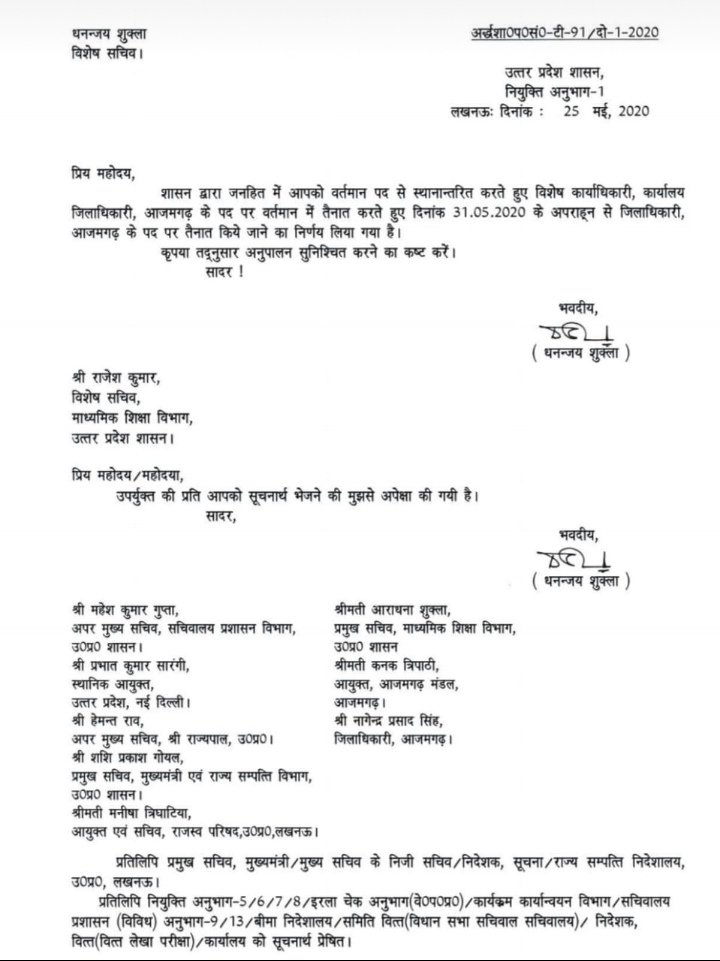 नियुक्ति अनुभाग के विशेष सचिव,धनन्जय शुक्ला द द्वारा जारी कल के आदेश में कहा गया है कि वह जिलाधिकारी कार्यालय आजमगढ़ में विशेष कार्य अधिकारी (ओएसडी) का कार्यभार ग्रहण करें और 31 मई को अपरान्ह जिलाधिकारी आजमगढ़ का चार्ज ग्रहण करें। देखें आदेश……….
