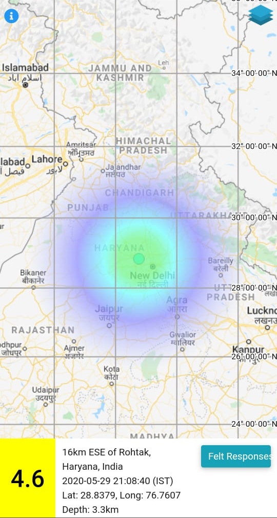 नई दिल्ली, 29 मई 2020। दिल्ली-एनसीआर में आज रात अचानक भूकंप के झटके महसूस किए गए। अचानक झटका महसूस होते ही लोग घरों से निकलकर बाहर भागे। भूकंप का केंद्र हरियाणा के रोहतक बताया गया है। राष्ट्रीय भूकंप विज्ञान केंद्र के मुताबिक, रात 9 बजकर 8 मिनट पर हरियाणा के रोहतक में भूकंप का झटका महसूस किया गया। रिक्टर स्केल पर भूकंप की तीव्रता 4.6 मापी गई है।