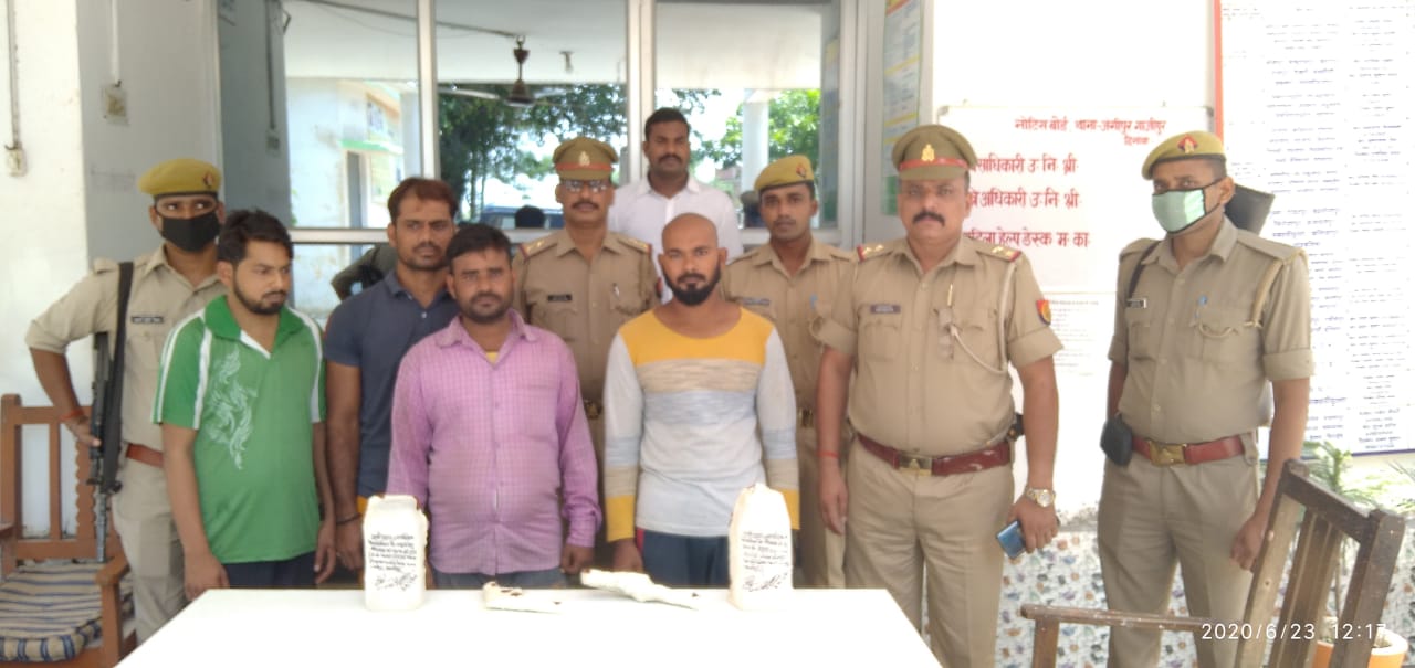 गाजीपुर,23 जून 2020। अपराधों की रोकथाम और अपराधियों के विरुद्ध चलाये जा रहे अभियान के अन्तर्गत पुलिस टीम ने मुखबिर की सूचना पर सोमवार की शाम बद्दूसराय चौराहे के पास से चार अभियुक्तों को गिरफ्तार कर उनके कब्जे से 24 किग्रा गोवंशीय मांस,दो अवैध तमंचा, कारतूस तथा एक बाइक व एक स्कूटी बरामद की।