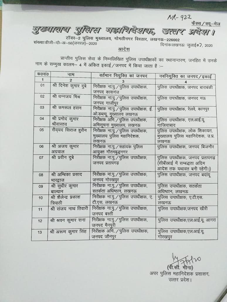 लखनऊ। प्रांतीय पुलिस सेवा के 13 निरीक्षकों को प्रोन्नति के पश्चात नवीन स्थानों पर तैनाती दी गई है। पीसी मीणा अपर पुलिस महानिदेशक प्रशासन उत्तर प्रदेश द्वारा जारी सूची के अनुसार दिनेश कुमार दुबे प्रभारी निरीक्षक/ उपाधीक्षक कासगंज को पुलिस उपाधीक्षक जनपद बाराबंकी, धनंजय मिश्र निरीक्षक/ पुलिस उपाधीक्षक गाजीपुर से पुलिस उपाधीक्षक मऊ, कमरुल हसन निरीक्षक/ पुलिस उपाधीक्षक ईओडब्ल्यू मुख्यालय लखनऊ से पुलिस अधीक्षक रेलवे कानपुर,प्रमोद कुमार श्रीवास्तव निरीक्षक/ पुलिस उप अधीक्षक अभिसूचना मुख्यालय लखनऊ से पुलिस उपाधीक्षक एलआईयू गाजियाबाद, सैयद सिराज हुसैन निरीक्षक/ पुलिस उपाधीक्षक मुख्यालय पुलिस महानिदेशक लखनऊ से पुलिस उपाधीक्षक लोक शिकायत मुख्यालय पुलिस महानिदेशक उत्तर प्रदेश लखनऊ, अजय कुमार अग्रवाल निरीक्षक/ सहायक पुलिस आयुक्त गौतम बुद्ध नगर से पुलिस उपाधीक्षक जनपद बिजनौर , प्रवीन दुबे निरीक्षक/ पुलिस अधीक्षक प्रतापगढ़ से पुलिस उपाधीक्षक प्रतापगढ़ (सीबीआई में संबद्धता अग्रिम आदेश तक बनी रहेगी), अंबिका प्रसाद भारद्वाज निरीक्षक/ पुलिस उपाधीक्षक जनपद गोरखपुर से पुलिस उपाधीक्षक जनपद बदायूं, सुधीर कुमार बाल्यान निरीक्षक/ पुलिस उपाधीक्षक सतर्कता अधिष्ठान लखनऊ से पुलिस उपाधीक्षक सतर्कता अधिष्ठान लखनऊ,शैलेंद्र प्रकाश त्रिपाठी निरीक्षक/ पुलिस उपाधीक्षक एटीएस लखनऊ से पुलिस उपाधीक्षक लखनऊ, संजय नाथ तिवारी निरीक्षक/पुलिस उपाधीक्षक बस्ती से पुलिस उपाधीक्षक जनपद खीरी, श्रवण कुमार राना निरीक्षक/ पुलिस उपाधीक्षक मैनपुरी से पुलिस उपाधीक्षक एलआईयू आगरा तथा अरुण कुमार सिंह निरीक्षक/पुलिस उपाधीक्षक जनपद जौनपुर से पुलिस उपाधीक्षक एलआईयू गोरखपुर के पद पर स्थानांतरित किए गए हैं।देखें सूची……….