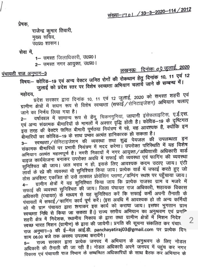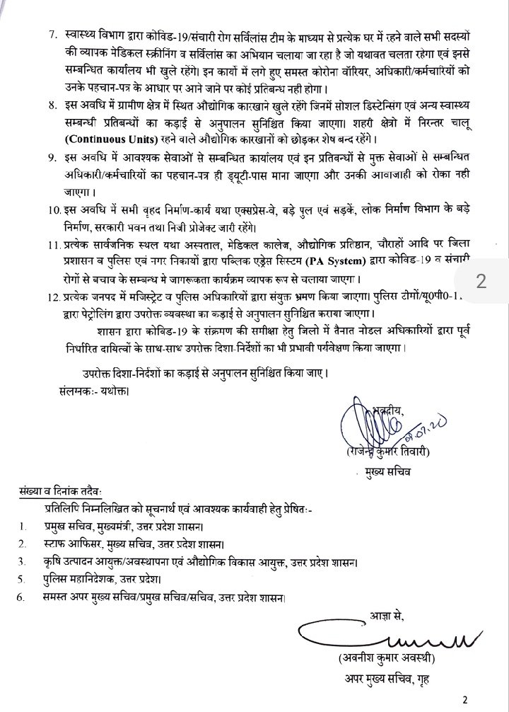 उत्तर प्रदेश के मुख्य सचिव राजेंद्र कुमार तिवारी द्वारा जारी आदेश में कहा गया है कि कोविड-19 की वर्तमान स्थिति की समीक्षा और संचारी रोगों (इंसेफेलाइटिस, मलेरिया, डेंगू और कालाजार) के संक्रमण को रोकने के लिए यह निर्णय लिया गया है। आदेश के मुताबिक, इस दौरान प्रदेश में समस्त कार्यालय, शहरी व ग्रामीण हाट, बाजार, गल्ला मंडी, और व्यवसायिक प्रतिष्ठान बंद रहेंगे। वहीं आवश्यक सेवाओं में कार्यरत व्यक्तिओं, कोरोना वॉरियर, स्वच्छताकर्मी व डोर स्टेप डिलीवरी से जुड़े लोगों की आवाजाही पर कोई प्रतिबंध नहीं रहेगा। रेलवे का आवागमन भी पूर्व की तरह ही जारी रहेगा। वहीं रेल से आने-जाने वाले व्यक्तियों के लिए बस की व्यवस्था राज्य सरकार करेगी। देखें आदेश……