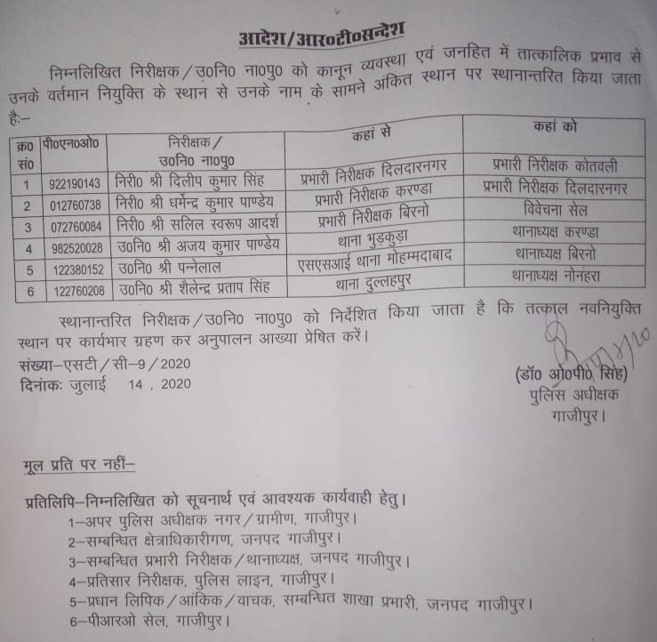 पुलिस अधीक्षक कार्यालय से जारी सूची के अनुसार, दिलदारनगर थाने के प्रभारी निरीक्षक दिलीप सिंह को अब सदर कोतवाली का प्रमुख बनाया गया है तो करंडा थाना प्रभारी निरीक्षक धर्मेंद्र कुमार पांडेय को दिलदारनगर थाना प्रभारी और बिरनो थाना प्रभारी निरीक्षक सलिल स्वरुप आदर्श को विवेचना सेल में नवीन तैनाती दी गयी है।