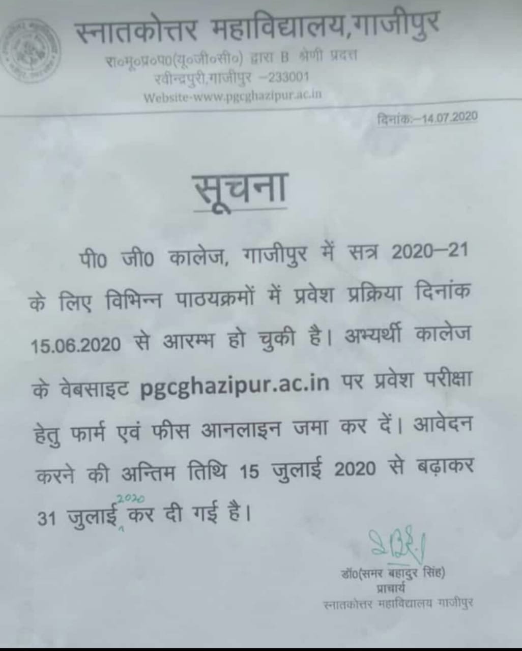 गाजीपुर । स्नातकोत्तर महाविद्यालय के वर्तमान सत्र में विभिन्न कोर्सों में प्रवेश के लिए आनलाईन प्रवेश आवेदन पत्र में हो रही समस्याओं के मद्देनजर आवेदन की अंतिम तिथि बढ़ाये जाने को लेकर पूर्व छात्र संघ उपाध्यक्ष दीपक उपाध्याय के नेतृत्व में छात्रों के प्रतिनिधि मंडल ने प्राचार्य डॉ समर बहादुर सिंह से मिलकर आनलाइन आवेदन पत्र जमा करने की अंतिम तिथि बढ़ाने की मांग की थी। छात्र हित को ध्यान में रखते हुए प्राचार्य ने विचारोंपरान्त, प्रवेश आवेदन पत्रों को आनलाइन जमा करने की तिथि 15 जुलाई से बढ़ाकर 31 जुलाई कर दी है। छात्र नेता दीपक उपाध्याय ने बताया कि विगत दिन छात्रों की समस्याओं को लेकर पत्रक दिया गया था जिस पर कार्रवाई करते हुए आवेदन तिथि बढाई गयी है। इससे प्रवेश के इच्छुक छात्र छात्राओं को लाभ मिलेगा।