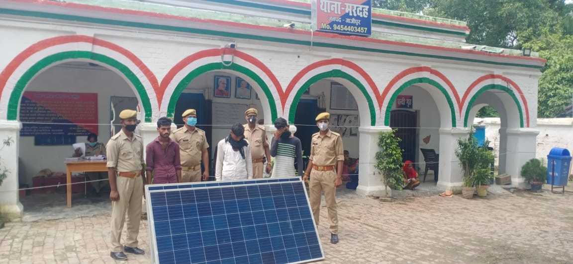 गाजीपुर। मरदह पुलिस ने सोमवार को चोरी के सोलर पैनल की प्लेटों को बेचने जा रहे तीन चोरों को गिरफ्तार कर जेल भेज दिया। मरदह थानाध्यक्ष शरतचन्द्र त्रिपाठी ने बताया कि नोनरा गांव निवासी अनिल सिंह के नलकूप पर लगे सोलर पैनल की प्लेटे 13 जुलाई की रात्रि में चोरी कर लिया था । चोरी की गयी अन्य प्लेटे इन्होंने बेचने की बात स्वीकार की है। गिरफ्तार विवेक भारती पुत्र चंद्रशेखर निवासी पंडिता, हरिशंकर उर्फ मटरू यादव पुत्र मुखदेव यादव निवासी मठिया भोजापुर व राजू कुमार राम पुत्र दिनेश राम निवासी छोटका मरदह को सम्बन्धित धारा के तहत जेल भेज दिया गया है। इनके अन्य साथियों की तलाश की जा रही है । गिरफ्तार करने वाली पुलिस टीम में एस एस आई नागेश्वर तिवारी,एस एस आई चंद्रशंकर मिश्रा, गौरव सिंह,कुलदीप बिंद, बृजेश यादव,कमलेश यादव शामिल रहे।