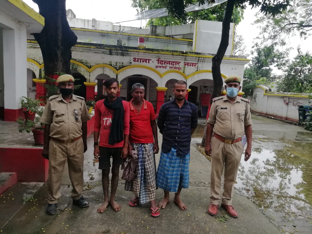 पुलिस द्वारा अपराध एवं अपराधियो के खिलाफ चलाये जा रहे अभियान के तहत दिलदारनगर थाना पुलिस ने रात में क्षेत्र के अमौरा घाट से तीन पशु तस्करों को दो गौवंशीय पशुओं के साथ गिरफ्तार कर लिया। गिरफ्तार अभियुक्तों में नदीम खाँ पुत्र कैश खाँ निवासी गोड़सरा थाना गहमर जनपद गाजीपुर, तौवाब खाँ पुत्र मेराज खाँ निवासी गोड़सरा थाना गहमर जनपद गाजीपुर तथा मनोबल चौधरी पुत्र स्व० सुनक चौधरी निवासी ग्राम छता बड़ाढ़ी थाना नुआँव जिला- कैमूर (भभुआ) बिहार रहे। इसके सम्बन्ध मे थाने पर मु0अ0सं0-181/20 धारा 3/5ए/8 गोवध निवारण अधिनियम पंजीकृत करते हुए विधिक कार्यवाही करते हुए जेल भेंज दिया गया।