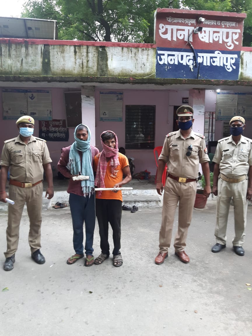 गिरफ्तार अभियुक्त कल्लू प्रजापति पुत्र रामबचन व लालता सोनकर पुत्र शिवनाथ सोनकर निवासीगण ग्राम रामपुर थाना खानपुर गाजीपुर हैं। बताया गया कि तलाशी से अभियुक्त कल्लू के पास से एक नाजायज चाकू व लालता सोनकर के पास से चोरी में प्रयुक्त होने वाला औजार सरिया बरामद हुआ। पुलिस ने दोनों के विरुद्ध मुकदमा दर्ज कर जेल भेंज दिया।