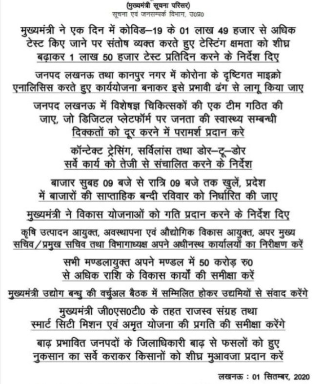 सीएम योगी ने कहा कि अब शुक्रवार रात से सोमवार सुबह तक की बंदी को समाप्त किया जा रहा है। बताते चलें कि सभी स्कूल-कालेज व कोचिंग संस्थान 30 सितम्बर तक बंद रहेंगे। 21 सितम्बर से कन्टेनमेंट जोन के बाहर के क्षेत्र में कक्षा 9 से 12 तक के छात्र शिक्षकों से परामर्श के लिए स्कूल-कालेज जा सकेंगे। स्कूलों में 50 प्रतिशत शिक्षक व कर्मचारियों को आनलाइन परामर्श के लिए बुलाया जा सकता है। कौशल विकास प्रशिक्षण संस्थानों, आईटीआई, कौशल विकास निगम या कौशल विकास मिशन में पंजीकृत अल्पकालिक प्रशिक्षण केंद्रों में कौशल या व्यावसायिक प्रशिक्षण की अनुमति होगी। इसके साथ ही सभी सिनेमाहाल, तरणताल, मनोरंजन पार्क, थिएटर, सभागार तथा इस प्रकार के अन्य स्थान बंद रहेंगे।