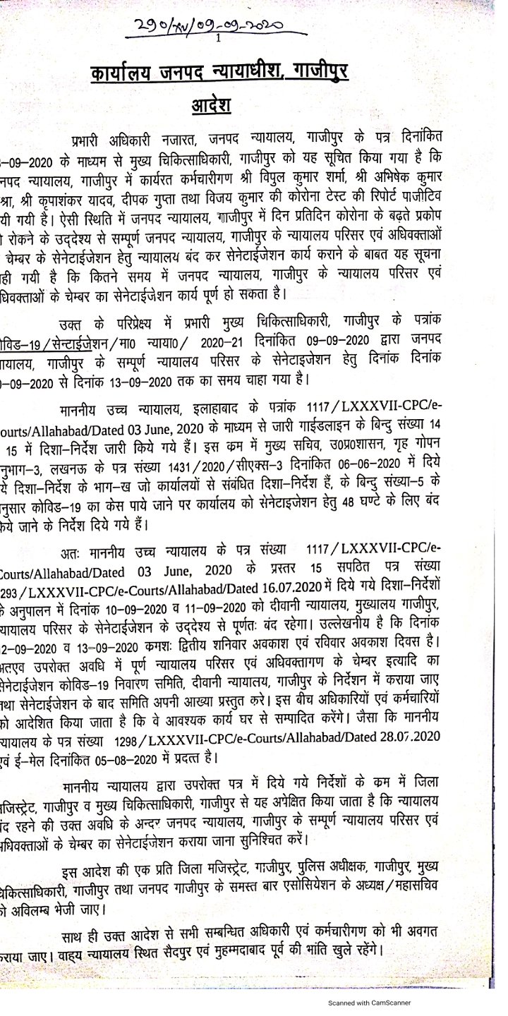 गाजीपुर ।कोरोना संक्रमण से बचाव हेतु जनपद न्यायाधीश के निर्देशानुसार दस व ग्यारह सितम्बर को जनपद न्यायालय के सम्पूर्ण न्यायालय परिसर एवं परिसर स्थित अधिवक्ताओं के चेम्बर का पूर्ण सेनेटाईजेशन कराने हेतु न्यायालय बंद रहेगा। इसके क्रम में कल दिनांक 10.09.2020 को निम्न टाइम स्लाट में विडियोकांफ्रेसिंग से सुनवाई करने के लिए आदेश किया गया। सुनील कुमार मुख्य न्यायिक मजिस्ट्रेट गाजीपुर पूर्वान्ह 10ः30 बजे से 11ः30 बजे तक, मो0 रिजवानुल हक प्रथम अपर जनपद एवं सत्र न्यायाधीश, गाजीपुर पूर्वान्ह 11ः30 बजे से 12ः30 बजे तक, गुलाब सिंह विशेष न्यायाधीश एससी/एसटी एक्ट अपरॉह 12ः30 बजे से 01ः30 बजे तक, विष्णु चन्द्र वैश्य चतुर्थ अपर जिला जज/विशेष न्यायाधीश ई0सी0एक्ट अपरॉह 02ः00 बजे से 03ः00 बजे तक, घनश्याम शुक्ला सिविल जज सीनियर डिवीजन गाजीपुर अपरॉह 3ः00 बजे से 4ः30 बजे तक निर्धारित है। 11.09.2020 को निम्न टाइम स्लाट में विडियोकांफ्रेसिंग से सुनवाइ्र करने के लिए आदेश किया गया है। शम्भवी न्यायिक मजिस्ट्रेट गाजीपुर पूर्वान्ह 10ः30 बजे से 11ः30 बजे तक, लक्ष्मी कान्त राठौर तृतीय अपर जनपद एवं सत्र न्यायाधीश, गाजीपुर पूर्वान्ह 11ः30 बजे से 12ः30 बजे तक, गौरव कुमार पंचम अपर जनपद एवं सत्र न्यायाधीश, द्वितीय गाजीपुर अपरॉह 12ः30 बजे से 01ः30 बजे तक, अजय श्रीवास्तव अपर सत्र न्यायाधीश पाक्सो न्यायालय, द्वितीय गाजीपुर अपरॉह 02ः00 बजे से 03ः00 बजे तक एवं गंगा शर्मा सिविल जज जूनियर डिवीजन गाजीपुर अपरॉह 3ः00 बजे से 4ः30 बजे तक निर्धारित हैं।