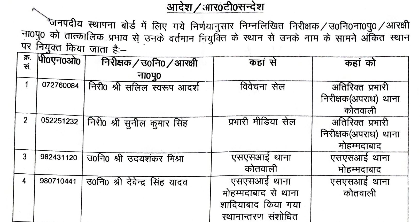 स्थानांतरित निरीक्षक के क्रम में सलिल स्वरूप आदर्श को विवेचना सेल से कोतवाली सदर में अतिरिक्त प्रभारी (अपराध) तथा सुनील कुमार सिंह प्रभारी मीडिया सेल को मुहम्मदाबाद कोतवाली का अतिरिक्त प्रभारी (अपराध) के पद पर नयी तैनाती दी गयी है।