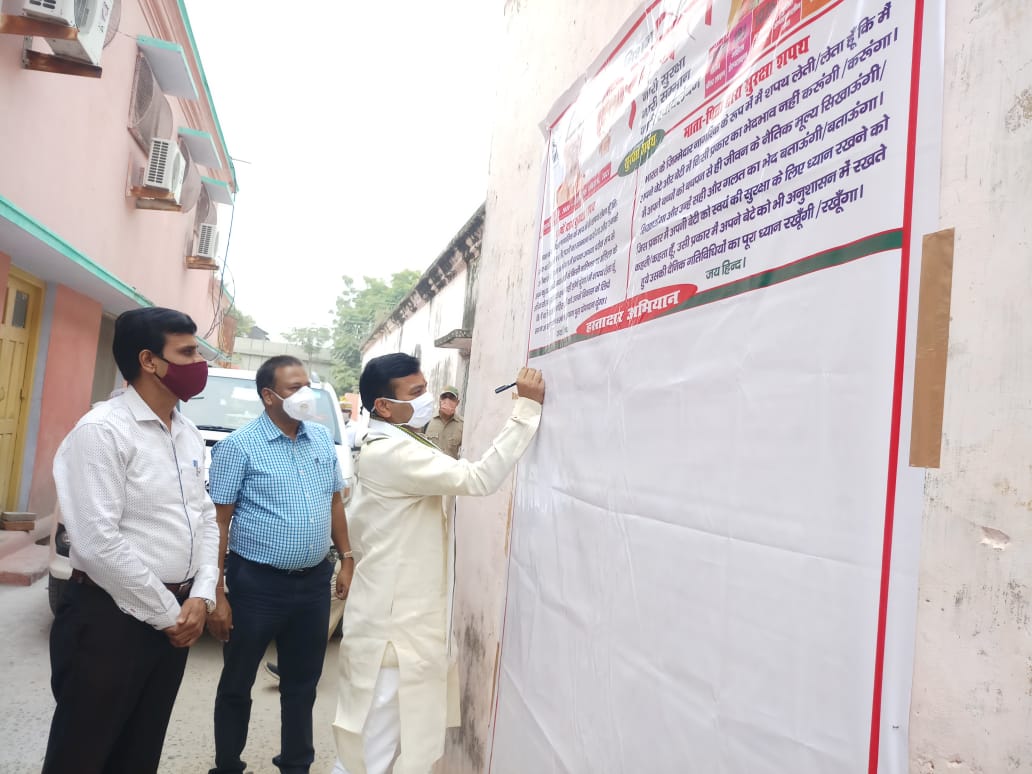 ग़ाज़ीपुर। मिशन शक्ति अभियान के प्रथम चरण के पॉचवे दिन जनपद के प्रभारी मंत्री आनन्द स्वरूप शुक्ल ने महिलाओं में जागरूकता लाने के उद्देश्य से आज जिला पंचायत प्रांगण में माता-पिता एंव पुरूषो द्वारा शपथ पोस्टर पर हस्ताक्षर कर हस्ताक्षर अभियान की शुरूआत की। उन्होने कहा कि बाल विवाह, सहायता, पुनर्वास तथा बाल विवाह करने/कराने हेतु दण्ड का प्राविधान है जिसे अक्षरशः पालन किया जाये।