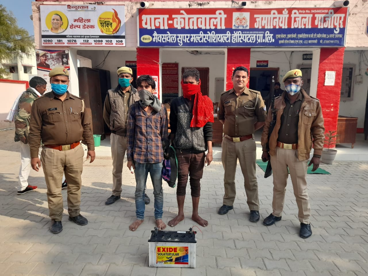 मुखबीर की सूचना पर पुलिस ने बैट्री चोर विजय कुमार पुत्र स्व. जवाहर लाल गुप्ता तथा मुलायम विन्द पुत्र स्व0 मुन्नी विन्द निवासीगण मदनपुरा रोड रेलवे स्टेशन जमानिया थाना जमानिया जनपद गाजीपुर को मय बैट्री, पिलास, पेचकस, चाकू के ग्राम करजही से गिरफ्तार किया गया। बाद गिरफ्तारी अभियुक्त के विरुद्ध कारर्वाई करते हुए जेल भेज दिया गया।