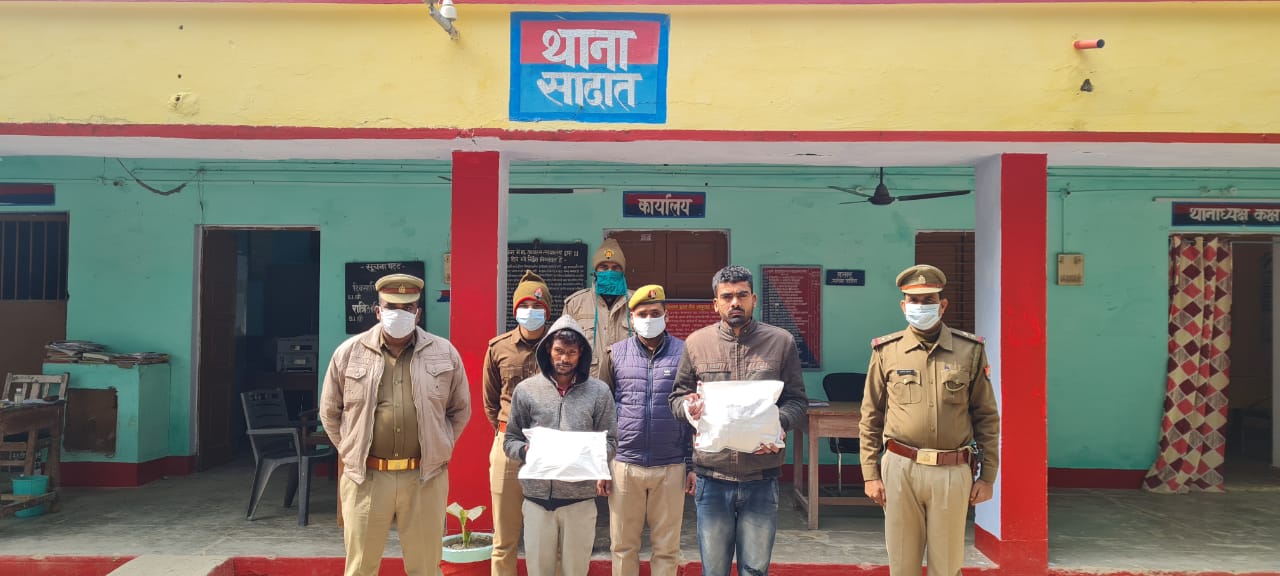 गाजीपुर। अपराध एवं अपराधियों के विरुद्ध चलाये जा रहे अभियान के अन्तर्गत सादात थाना पुलिस ने क्षेत्र के मखदूमपुर बाजार में अपराधियों की टोह में लगी थी। उसी दौरान मुखबिर की सूचना पर खिदिरगंज नहर पुलिया के समीप से दो संदिग्ध लोगों को रोक कर उनके झोले की तलाशी ली,तो दोनों लोगों से 2 किलो 400 ग्राम अवैध गांजा बरामद हुआ।