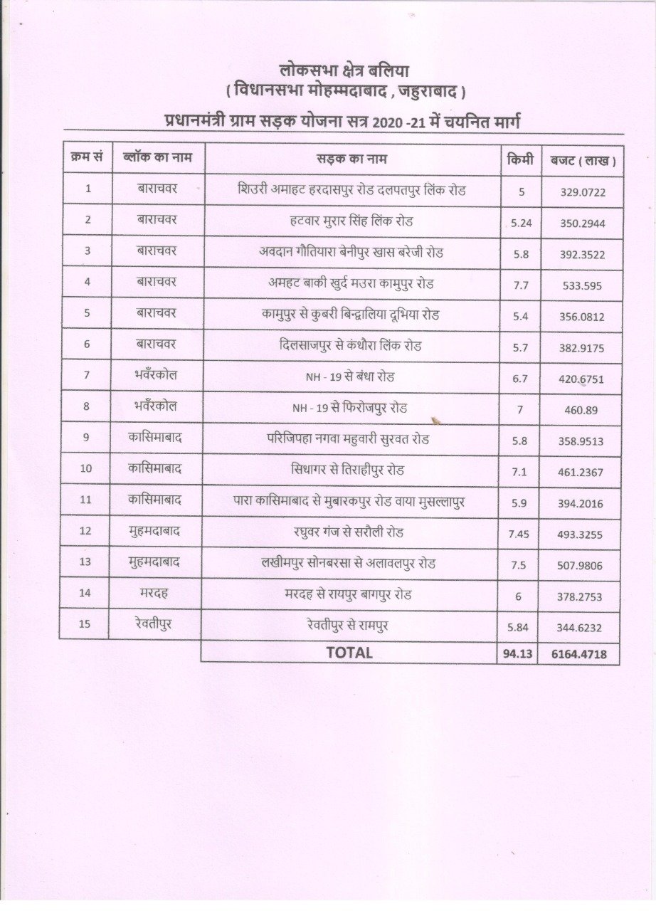 स्वीकृत सड़कों में बाराचवर ब्लाक की छह सड़कें- जिसमें सिउरी अमहट- हरदासपुर रोड (दलपतपुर लिंक मार्ग) दूरी 5 किमी बजट 329.0722 लाख रुपये, हटवार मुरार सिंह लिंक रोड 5.2 4 किलोमीटर 350.2944 लाख रुपये, आवादान गौतियारा बेनीपुर खास बरेजी रोड, 5.8 किमी, 392.3522 लाख,अमहट बाकी खुर्द मउरा कामूपुर रोड,7.7 किमी,533.595 लाख,कामूपुर से कुबरी बिन्दवलिया दुबिहा रोड,5.4 किमी,356.0812 लाख तथा दिलसाजपुर से कंधौरा लिंक रोड,5.7 किमी,382.9175 लाख, भांवरकोल ब्लाक के एन एच 19 से बंधा रोड,6.7 किमी,420.6751 लाख,एन एच 19 से फिरोजपुर रोड,7 किमी,460.89 लाख, और कासिमाबाद ब्लाक के तीन मार्ग परजीपाह नगवां महुआरी सुरवत रोड,5.8 किमी,358.9513 लाख, सिधागर से तिराहीपुर रोड,7.1 किमी,461.2367 लाख,पारा कासिमाबाद से मुबारकपुर रोड वाया मुसल्लहपुर, 5.9 किमी,394.2016 लाख व मुहम्मदाबाद ब्लॉक के दो मार्गों रघुवरगंज से सरौली रोड,दूरी 7.45 किमी,स्वीकृत राशि 493.3255 लाख रुपये तथा लखीमपुर सोनबरसा से अलावलपुर रोड 7.5 किमी,507.9806 लाख, मरदह ब्लाक के मार्ग मरदह से रायपुर बाघपुर रोड, 6 किमी, 378.2753 लाख एवं रेवतीपुर ब्लाक के रेवतीपुर से रामपुर रोड ,5.84 किमी,344.6232 लाख रूपए की योजनाओं को स्वीकृति प्राप्त हुई है।