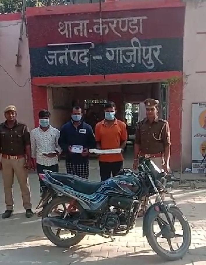 गिरफ्तार अभियुक्तों में इन्द्रजीत यादव उर्फ खूटा पुत्र रामअवध यादव, निवासी ग्राम महुलिया, थाना सैदपुर, गाजीपुर, शैलन्द्र यादव पुत्र लालजी यादव, निवासी खानकाह खुर्द, जेवल, थाना करण्डा, गाजीपुर तथा संजीव कुमार सिंह उर्फ गोलू पुत्र रामप्रवेश सिंह, निवासी कटरिया, थाना करण्डा, गाजीपुर रहे। पूछताछ में अभियुक्तों ने बताया कि हमलोग रात्रि में गाँव देहात व छोटी चट्टियों पर इसी मोटरसाइकिल से दिन में ही रेकी करते हैं तथा रात्रि में मौका देखकर चोरी करते हैं। आज भी हम लोग इसी उद्देश्य से इकट्ठा हुए थे और बड़सरा बाजार में कहीं मौका देखकर सोने-चाँदी के दुकानों में चोरी की योजना बना रहे थे कि आप लोगों द्वारा पकड़े गये हैं। अभियुक्तों द्वारा बताया गया कि गत 23 जनवरी की शाम को हम लोगों ने धरम्मपुर बाजार में सड़क के किनारे खड़ी साइकिल से मौका देखकर झोला निकाला था, जिससे कुल रु. 25000/-, एटीएम, आधार कार्ड, फिंगर प्रिन्ट मशीन,लैपटाप व एक मोबाइल मिला था।
