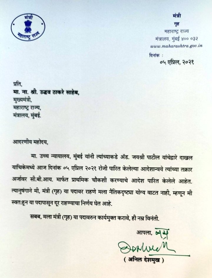 उल्लेखनीय है कि महाराष्ट्र के गृह मंत्री अनिल देशमुख पर भ्रष्टाचार के गंभीर आरोप लगे थे और मामले की निष्पक्ष जांच के लिए लगातार उनके इस्तीफे की मांग की जा रही थी।