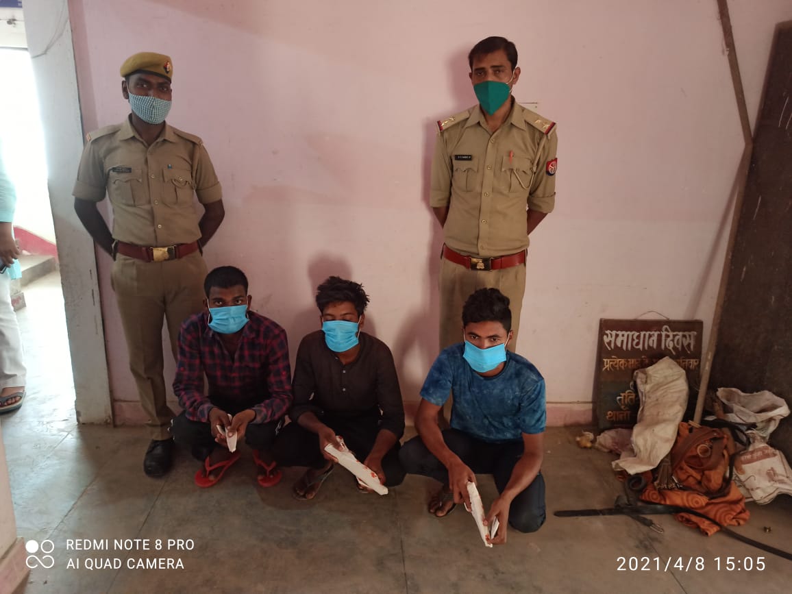 बताया गया कि आगामी त्रिस्तरीय पंचायत चुनाव के मद्देनजर अपराध एवं अपराधियों के विरूद्ध चलाये जा रहे अभियान के क्रम में थाना कासिमाबाद के वरिष्ठ उपनिरीक्षक फूलचन्द्र पाण्डेय मय हमराह क्षेत्र में भ्रमणशील होकर ग्राम अविसहन के पास सराय मुबारक मोड़ पर चेकिंग कर रहे थे,चेकिंग के दौरान ही पुलिस टीम ने तीन अभियुक्तों को गिरफ्तार किया। गिरफ्तार अभियुक्तों की जामा तलाशी के दौरान एक अभियुक्त के पास से एक तमंचा .315 बोर मय जिंदा कारतूस तथा दूसरे अभियुक्त के पास से एक अवैध तमंचा .12 बोर व एक जिंदा कारतूस तथा तीसरे अभियुक्त के पास से अवैध चाकू तथा तीनों अभियुक्तों के पास से 02-02 हजार रूपये चोरी का बरामद किया गया।