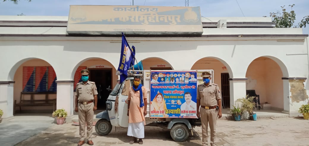 आदर्श आचार संहिता व प्रदेश मे लागू धारा 144 द0प्र0स0 का उलंघन करते हुये पकड़े गये, वाहन को सीज कर जिला पंचायत सदस्य पद प्रत्याशी प्रमिला देवी पत्नी राजेन्द्र राजभर, पति राजेन्द्र राजभर पुत्र रामदेव राजभर निवासी दुबिहा थाना करीमुद्दीनपुर जनपद गाजीपुर व वाहन चालक रामाश्रय राम पुत्र स्व. राजदेव राम निवासी ग्राम खडहरा थाना करीमुद्दीनपुर के विरुद्ध अभियोग पंजीकृत करके उक्त टैम्पू को सीजकर विधिक कार्यवाही की गयी है।