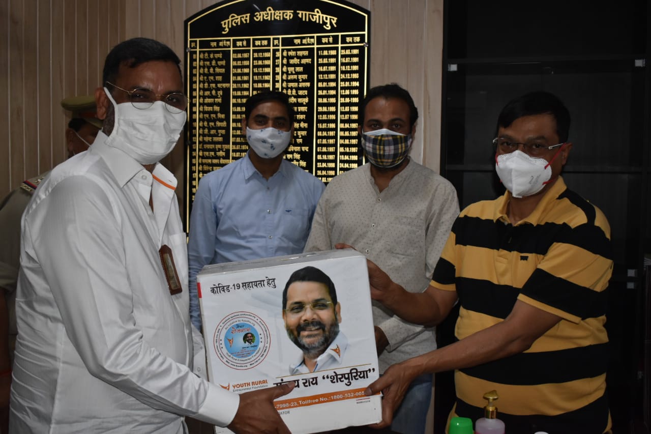 इसी क्रम में यूथ रुरल एंटरप्रेन्योर फाउंडेशन के संजय राय शेरपुरिया तथा उनकी टीम ने पुलिस अधीक्षक डा.ओमप्रकाश सिंह के आवास पर भेंट कर पुलिस लाइन में चल रहे कोविड-19 अस्पताल एवं पुलिस कर्मियों के लिए कन्सन्ट्रेटर, फेसशील्ड मास्क, टेली मेडिसिन की दवाइयां और जरूरी सहायता दी गई। इसके साथ ही साथ फाउंडेशन द्वारा जिले में पांच हजार पुलिस परिवार को मेडिसिन कीट भी उपलब्ध कराया गया।