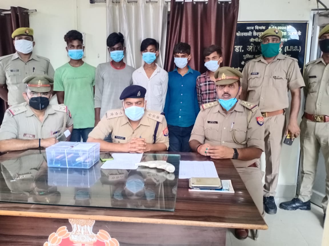 बताया गया कि पुलिस अधीक्षक द्वारा वांछित अभियुक्तों, पुरस्कार घोषित अपराधियों की गिरफ्तारी हेतु चलाये जा रहे अभियान के अन्तर्गत कोतवाली सैदपुर की पुलिस टीम ने जोगीवीर तिराहा से अपरांह साढ़े चार बजे पांच अभियुक्तों को गिरफ्तार किया। अभियुक्तों के पास से एक देशी तमंचा .315 बोर मय कारतूस,13 मोबाइल सेट, नगदी व तीन मोटरसाइकिल बरामद किया।