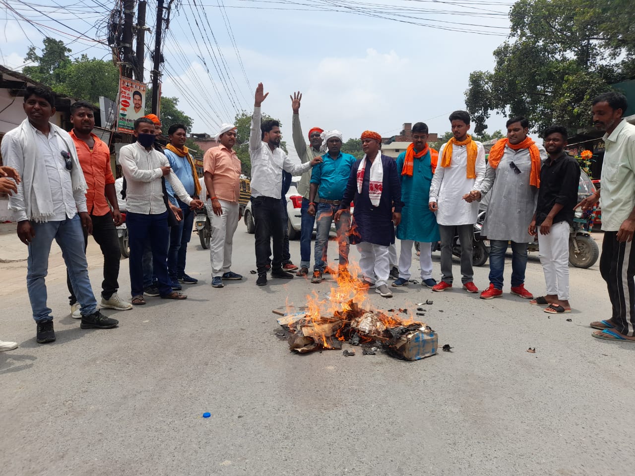 गाजीपुर। भारतीय जनता युवा मोर्चा काशी क्षेत्र के पूर्व क्षेत्रीय अध्यक्ष राजेश राजभर के नेतृत्व में जुलूस निकालकर, लंका बस स्टैंड पर सुभासपा के राष्ट्रीय अध्यक्ष ओमप्रकाश राजभर एंव एआइएमएम के नेता ओबेदुद्दीन ओबैसी का पुतला दहन किया गया।