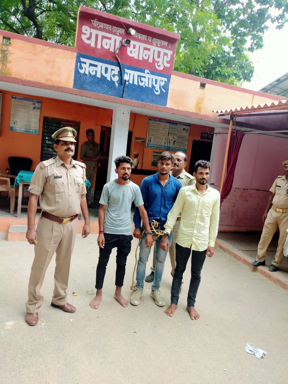 गिरफ्तार अभियुक्तों में अजीत राजभर पुत्र विजेन्दर राजभर निवासी ग्राम जियापुर थाना मेहनाजपुर जनपद आजमगढ़ हालपता ग्राम कोलवर कुण्डी थाना सैदपुर जिला गाजीपुर, किशन राजभर पुत्र श्री राम प्रसाद राजभर निवासी ग्राम जियापुर थाना मेहनाजपुर जनपद आजमगढ़ तथा अखिलेश राजभर पुत्र बैजनाथ राजभर निवासी ग्राम जियापुर थाना मेहनाजपुर जनपद आजमगढ़ रहे। इसके सम्बन्ध में थाना खानपुर में अभियोग पंजीकृत कर आवश्यक विधिक कार्यवाही करते हुए चालान न्यायालय के सुपुर्द किया गया।