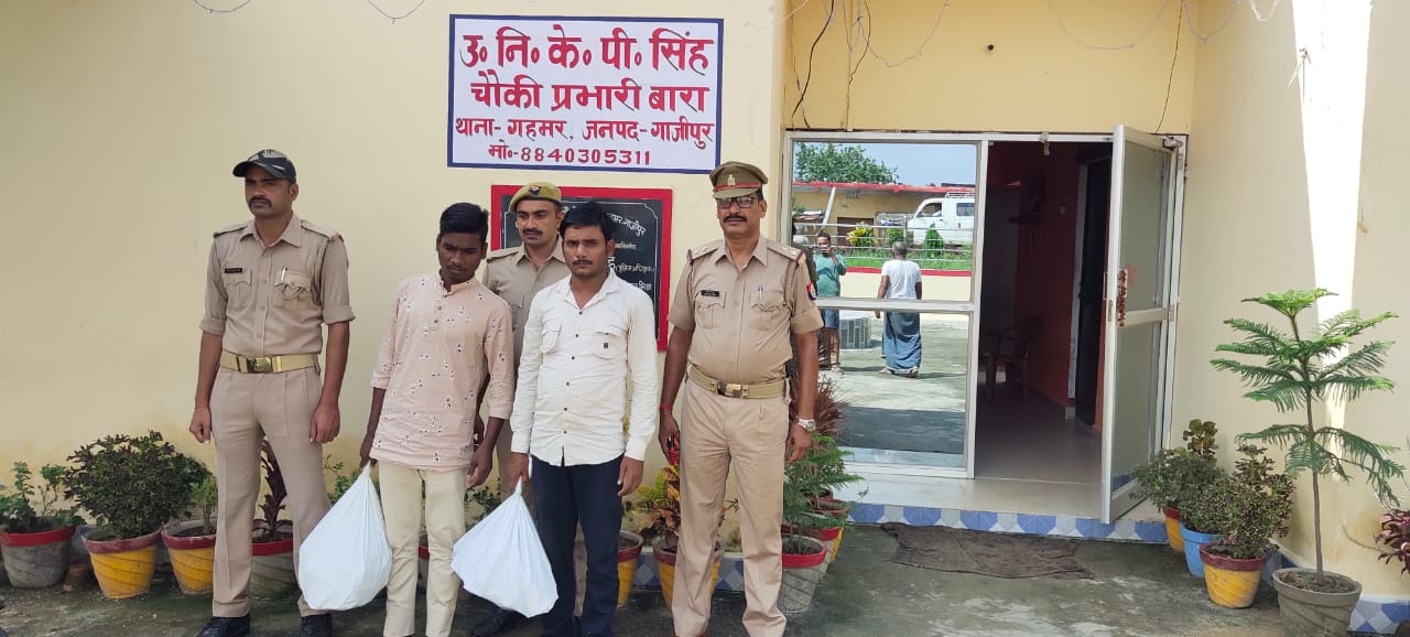 बताते चलें कि पुलिस अधीक्षक द्वारा अवैध शराब की तस्करी की रोकथाम हेतु चलाये जा रहे अभियान के तहत पुलिस टीम ने बारा तिराहा थाना गहमर गाजीपुर के पास से अभियुक्त राजू प्रसाद पुत्र गुरुचरन प्रसाद निवासी सन्दलपुर बाजार थाना बहादुरपुर पटना बिहार तथा अविनाश कुमार पुत्र बिरजू पासवान निवासी मुराल्लाहपुर थाना पिरबहोर पटना बिहार के पास से 60 शीशी देशी शराब ब्ल्यू लाइम (मात्रा 200 मि.ली.) व 35 पाउच 8 पीएम अग्रेजी शराब (मात्रा 180 मि.ली.) बरामद किया।