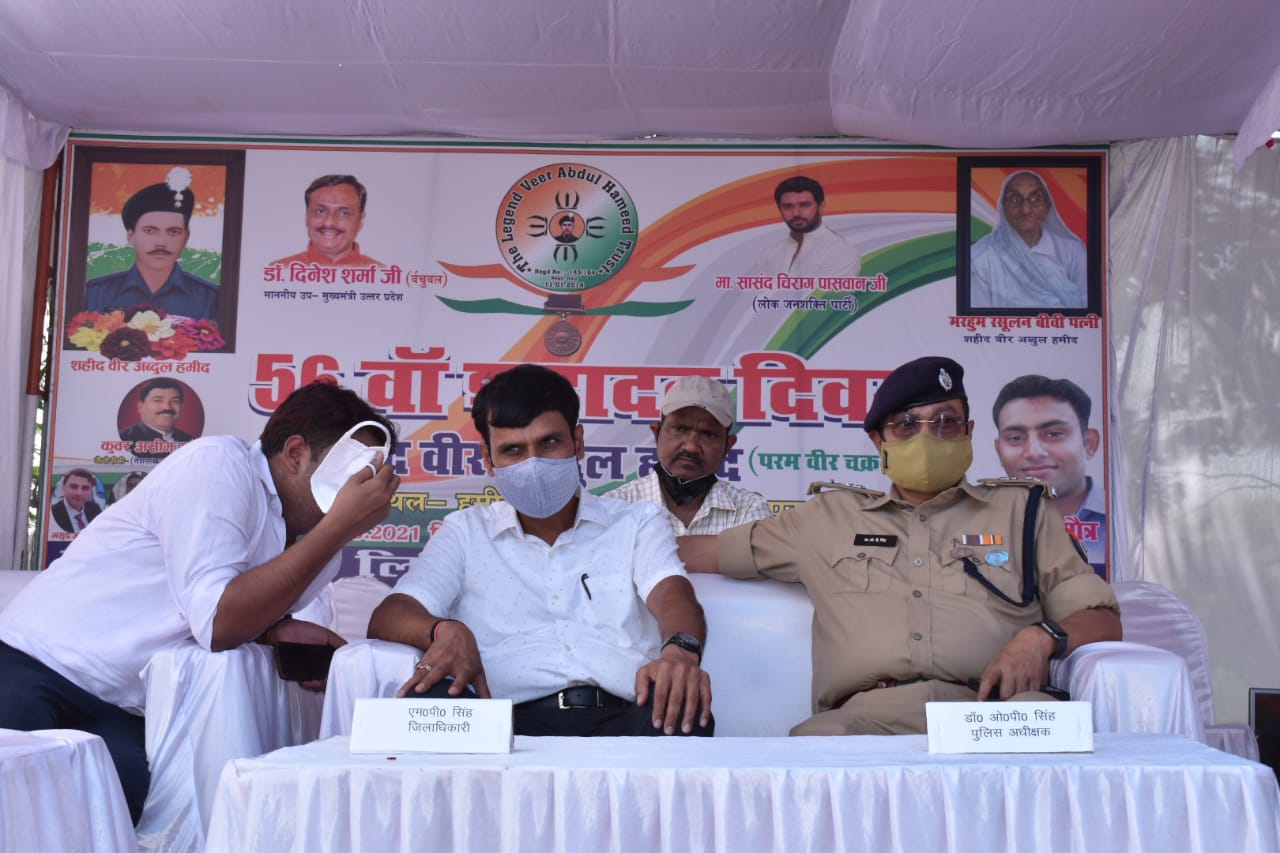 पुलिस अधीक्षक डा. ओम प्रकाश सिंह ने कहा कि धन्य है वह माता-पिता जिन्होंने ऐसे वीर सपूत को जन्म दिया। परमवीर चक्र विजेता वीर अब्दुल हमीद ने आज ही के दिन पाकिस्तान से युद्ध के दौरान आठ पैटर्न टैंक को ध्वस्त करके भारत माता की रक्षा की। आज उन्हे सच्ची श्रद्धांजलि देने का अवसर है। उन्ही की प्रेरणा है कि आज जनपद में जगह-जगह पर युवा सेना में भर्ती होने के लिए तैयारियां करते हुए दिखाई देते हैं। उन्होंने कहा कि यह एक निःस्वार्थ प्रमाण है कि देश के लिए अगर एक शहीद होगा तो यहां से एक लाख अपनी शहादत देने के लिए तैयार होगे, यह गाजीपुर की धरती के लिए वरदान है। आज इनके लिए सच्ची श्रद्धांजलि यही होगी कि हम लोग यह संकल्प लेकर जाये कि देश की रक्षा के लिए अगर अपने प्राणो की आहूति भी देनी पड़े तो पीछे नही हटेगे। कार्यक्रम में कर्नल नितिन थापा एवं उनकी टीम, कर्नल ए.के सिंह जिला सैनिक कल्याण बोर्ड गाजीपुर, कपिल देव राम जिला युवा अधिकारी नेहरू युवा केन्द्र,जय प्रकाश यादव नायब तहसीलदार ने वीर अब्दुल हमीद को श्रद्धांजलि अर्पित की। कार्यक्रम का संचालन नेहरू युवा केन्द्र के एसीटी सुभाष चन्द्र प्रसाद ने किया।