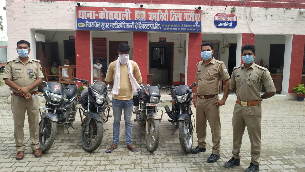 गाजीपुर। जमानियां थाना पुलिस ने एक मोटरसाइकिल चोर को गिरफ्तार कर उसके कब्जे से चार मोटरसाइकिल बरामद किया है।