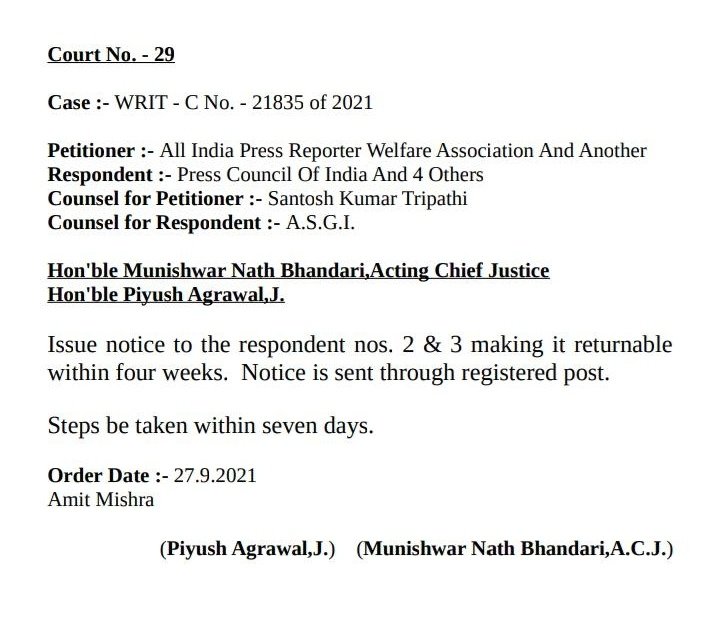 प्रेस काउंसिल ऑफ इंडिया – उच्च न्यायालय ने चेयरमैन एवं सचिव को जारी किया नोटिस