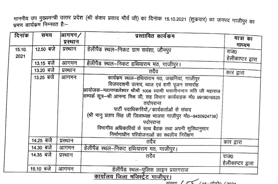 उप मुख्यमंत्री के कार्यक्रम की पुष्टि भाजपा जिलाध्यक्ष भानू प्रताप सिंह ने करते हुए बताया कि दशहरा के दिन दोपहर बाद सिद्धपीठ पर उनका आगमन होगा। इसे लेकर हेलीपैड निर्माण व अन्य आवश्यक तैयारियां की जा रही हैं।