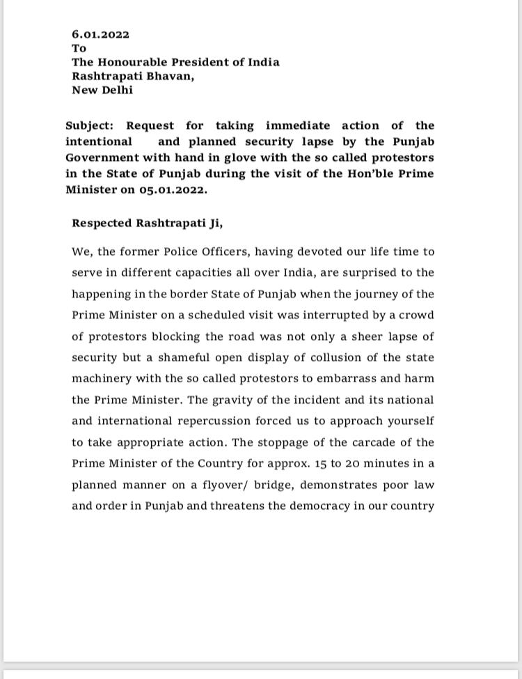 नई दिल्ली। पंजाब के पूर्व पुलिस महानिदेशक सहित देश के 27 पूर्व आईपीएस अफसरों ने राष्ट्रपति को पत्र लिखकर प्रधानमंत्री की सुरक्षा में चूक को बेहद गंभीर बताया है।इन अफसरों में अधिकतर पूर्व डीजीपी हैं। अफसरों ने राष्ट्रपति से सुरक्षा चूक के लिए जिम्मेदारों के खिलाफ सख्त एक्शन की मांग की है ।
