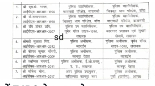 वहीं रविशंकर छवि पुलिस उपमहानिरीक्षक वूमेन पावर लाइन-1090 को पुलिस उपमहानिरीक्षक जेल हेडक्वार्टर बनाया गया है। सुजाता सिंह पुलिस अधीक्षक बहराइच को पुलिस अधीक्षक वूमेन पावर लाइन-1090 लखनऊ, केशव चौधरी पुलिस अधीक्षक कानपुर देहात को पुलिस अधीक्षक बहराइच तथा स्वप्निल ममगैई पुलिस अधीक्षक ईओडब्ल्यू लखनऊ को पुलिस अधीक्षक कानपुर देहात तथा सोमेन्द्र मीना अपर पुलिस उपयुक्त कमिश्नरेट कानपुर नगर को पुलिस अधीक्षक