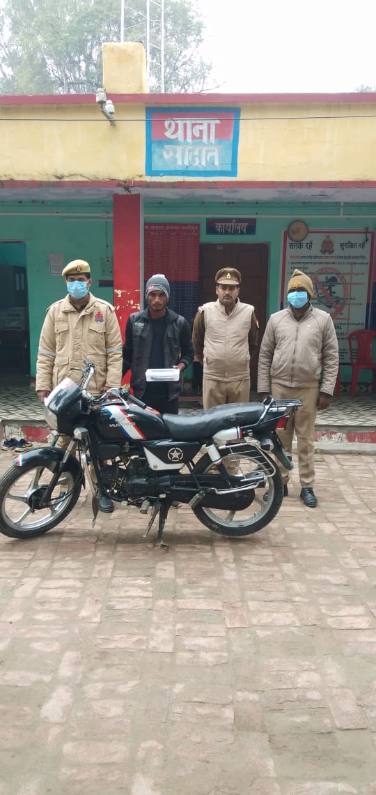 गाजीपुर। सादात थाना पुलिस टीम द्वारा शातिर अभियुक्त को चोरी की हीरो होण्डा स्प्लेण्डर प्रो व नाजायज तमंचा मय जिन्दा कारतूस के साथ गिरफ्तार किया गया।