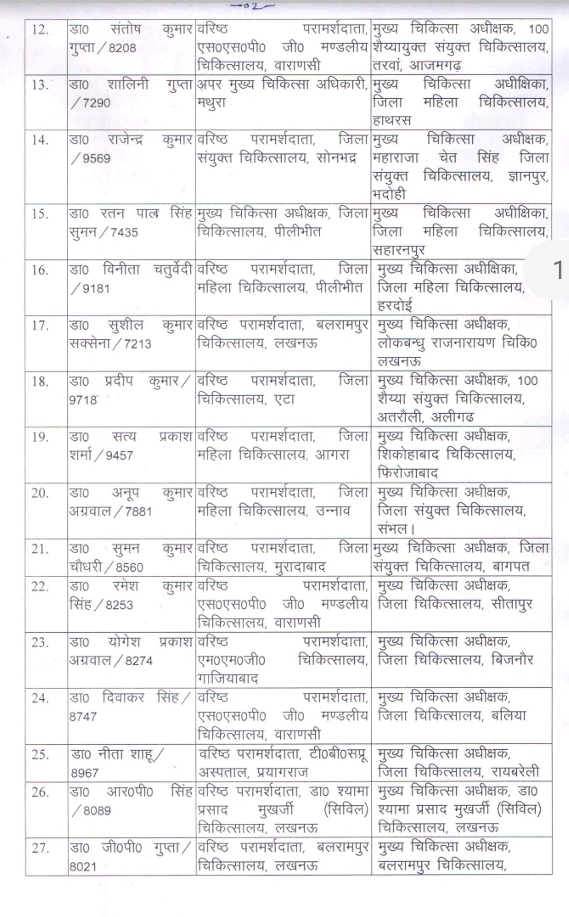 लखनऊ। उत्तर प्रदेश शासन चिकित्सा अनुभाग-2 द्वारा बड़े पैमाने पर मुख्य चिकित्सा अधीक्षक के तबादले करते हुए उन्हें नये स्थानों पर तैनाती दी गयी है। आदेश में बताया गया है कि तत्कालिक प्रभाव से प्रादेशिक चिकित्सा एवं स्वास्थ्य सेवा संवर्ग के संयुक्त निदेशक ग्रेड के निम्न तालिका के स्तम्भ-2 में उल्लिखित चिकित्साधिकारी, जो स्तम्भ-3 अंकित पद एवं स्थान पर कार्यरत हैं. को प्रशासनिक आवश्यकताओं / जनहित में तम्भ 4 में अंकित पद एवं स्थान पर एतदद्वारा तैनात किया जाता है देखें स्थानांतरण सूची …….