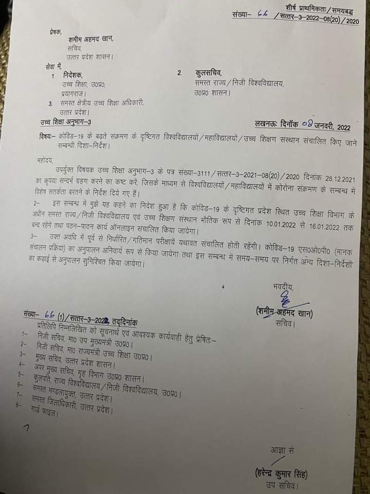 लखनऊ। 10 जनवरी से 16 जनवरी तक बढ़ते कोविड मामलों के कारण ऑनलाइन क्लासेज के लिए निर्देश जारी किए गए हैं। पूर्व से चल रही परीक्षाएं निर्धारित क्रम में जारी रहेंगी। सचिव उच्च शिक्षा ने इस सम्बन्ध में आदेश जारी किया है। आदेश के क्रम में सोमवार से सभी कालेज आन लाइन क्लासेज चलायेंगे । देखें आदेश